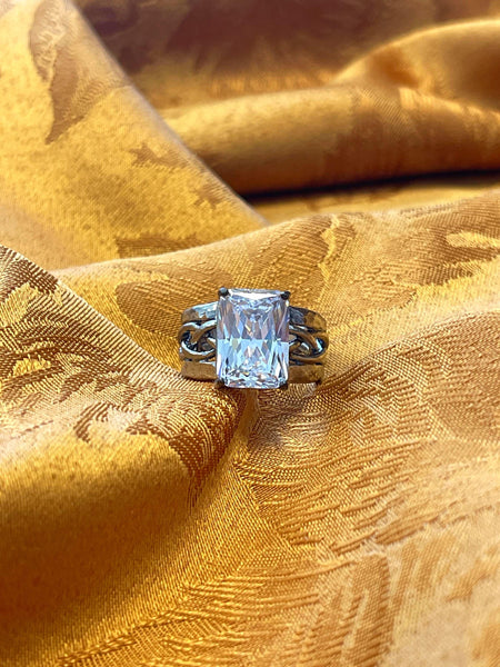 Quick Shop women's ring, rectangle stone, twisted band, magical, mystical, clear, silver $57.00 Quick Shop